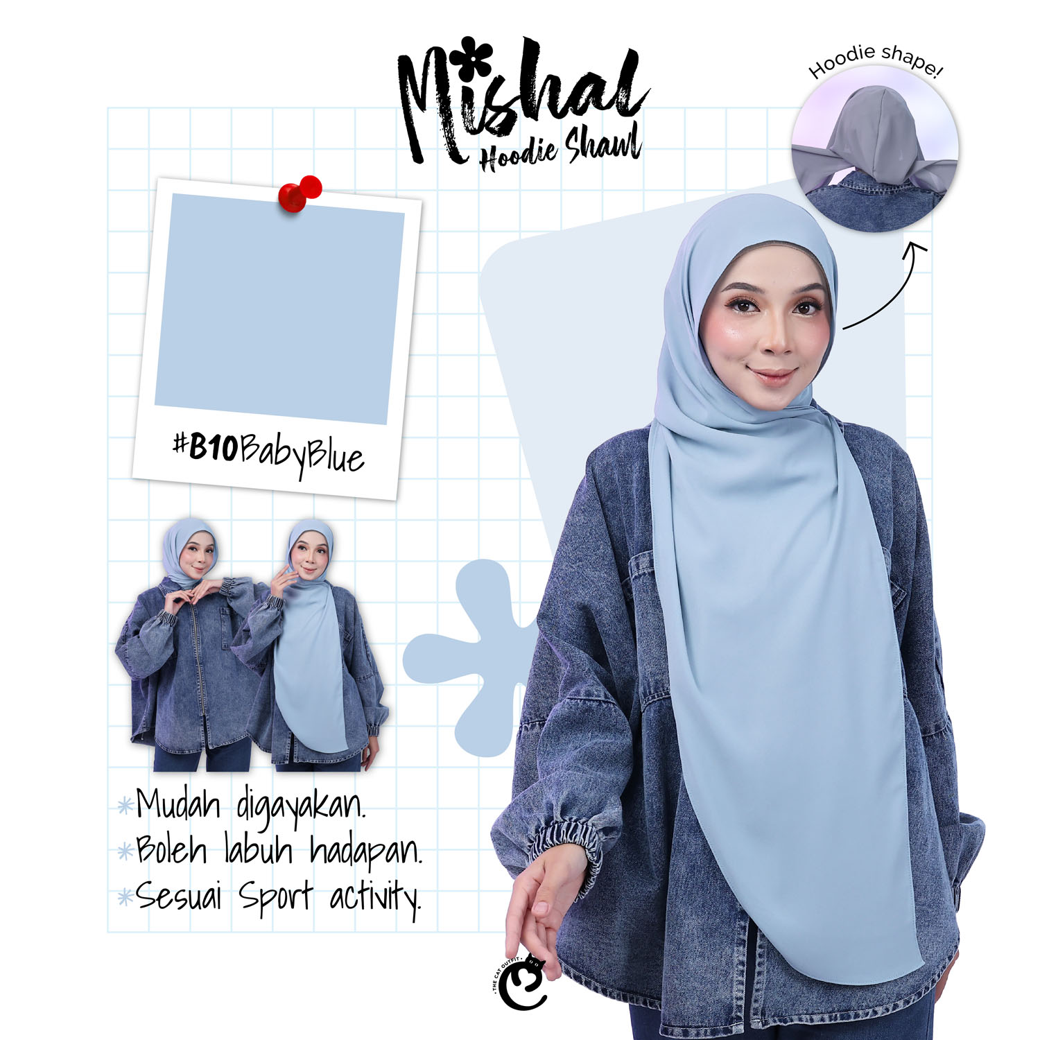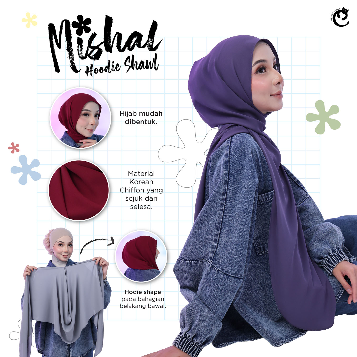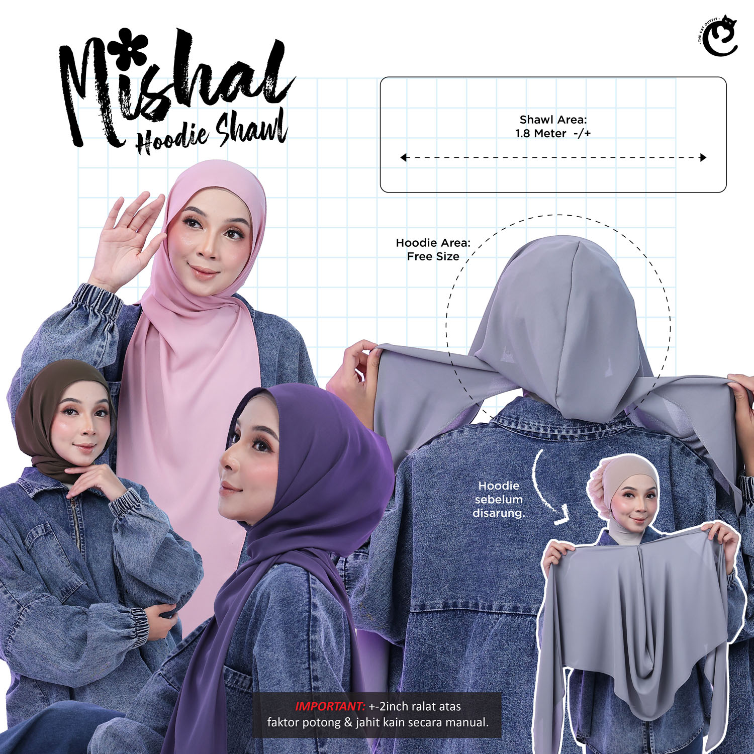 - HOODIE SHAWL MISHAL: Produk ini adalah HOODIE SHAWL MISHAL, yang terbuat daripada ORGANIC HQ CHIFFON PLAIN PREMIUM.