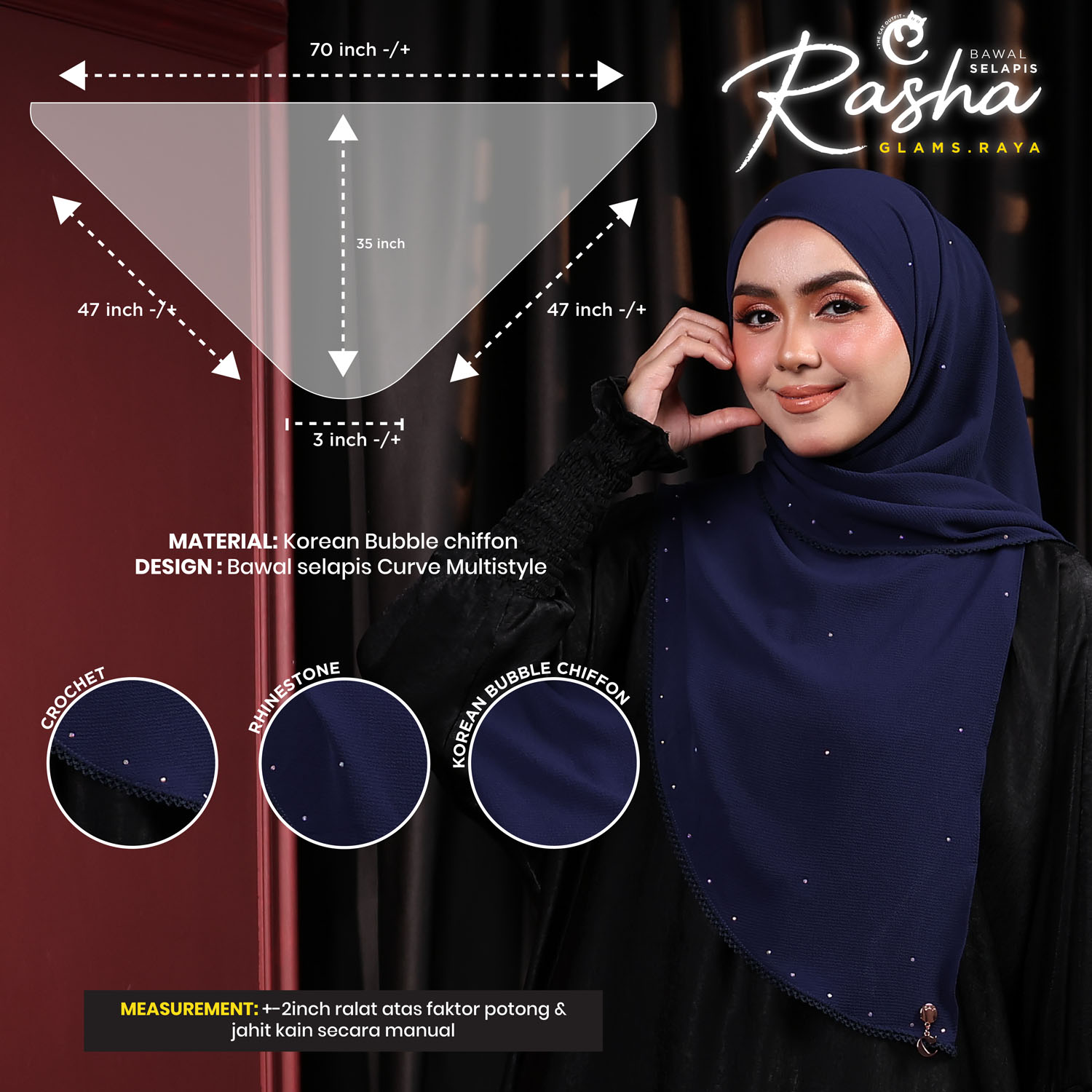 MEASUREMENTÂ : (+-2inch) atas faktor potong & jahit kain